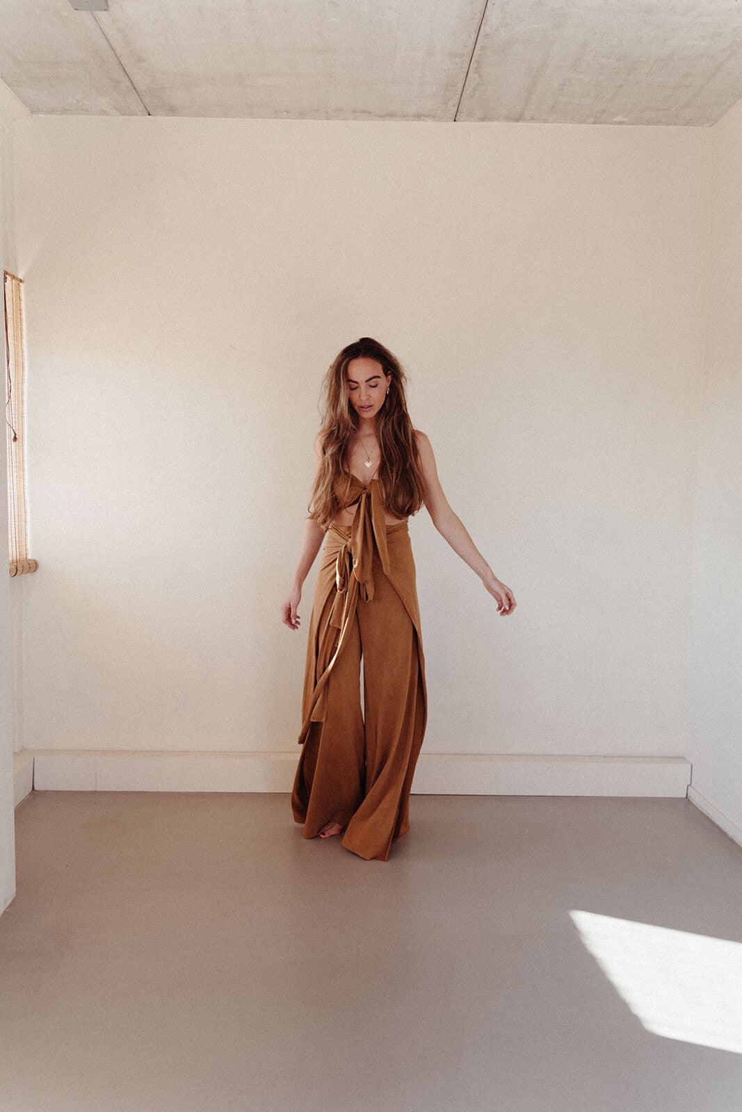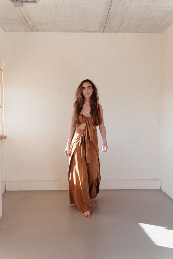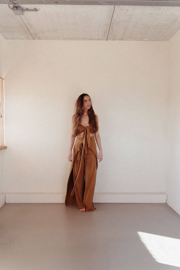 This two piece is made out of the most beautiful hennep elastane fabric, its comfy and stretchy and is worn to feel very feminine, you can leave your measurements ( inner leg length, waist, hips and buste in cm ) and leave them in the notes while placing your order.
