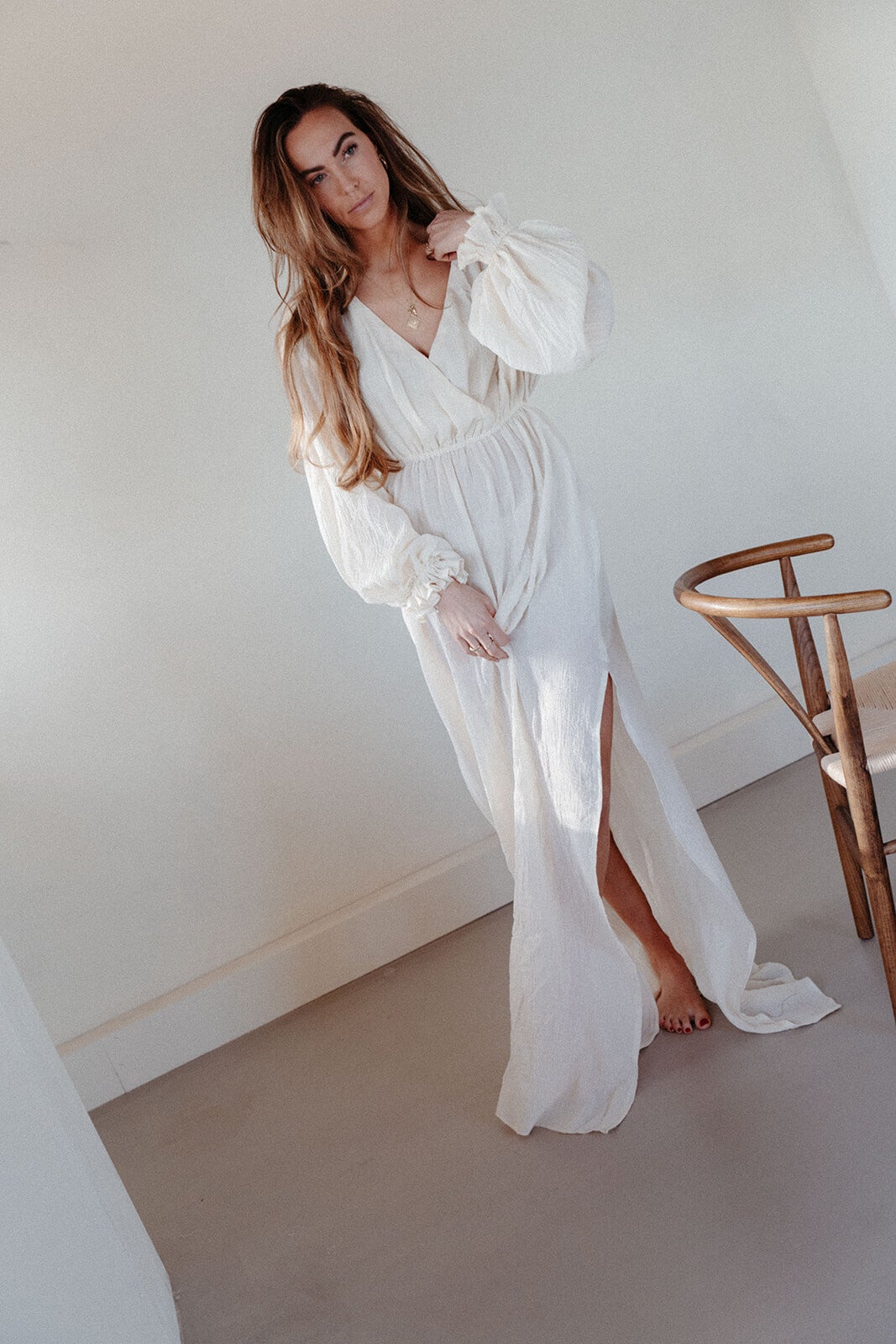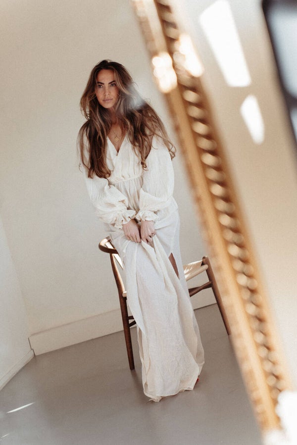 The larya dress in ivory is a free sized dress made out of a beautiful crinkle cotton and can be worn from a size 34 until 44 you can add your own perfect long length for the dress measurements in the notes while placing the order.