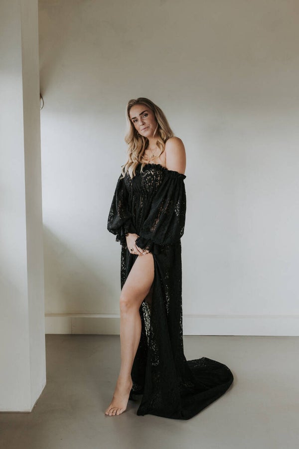 The eden dress in black lace is made out of a viscose fabric and can be made by size from a size 34 until 42, you can add your own measurements in the notes while ordering your dream dress, add your waist, hips, bust and total length from neckline until the length you prefer.