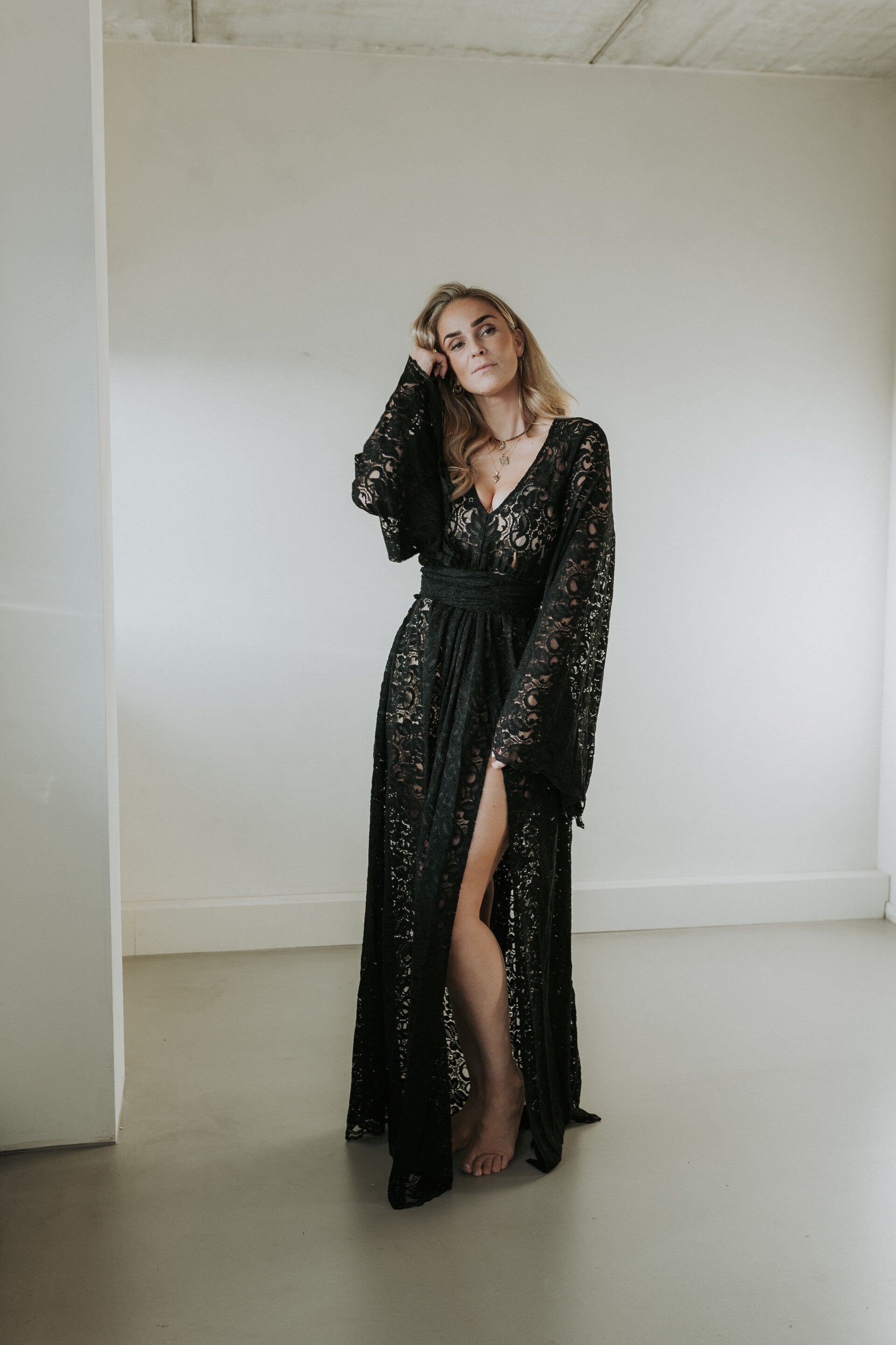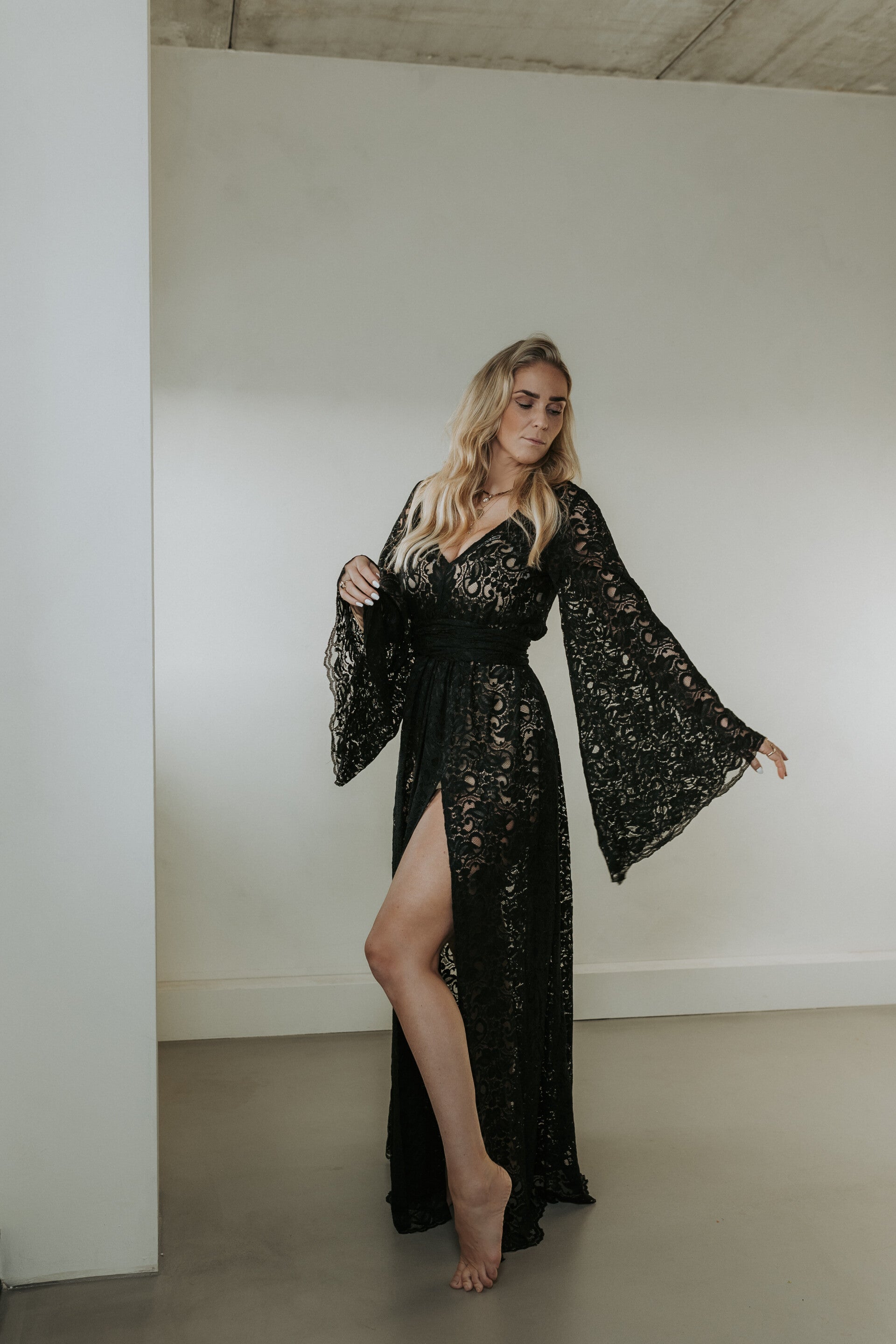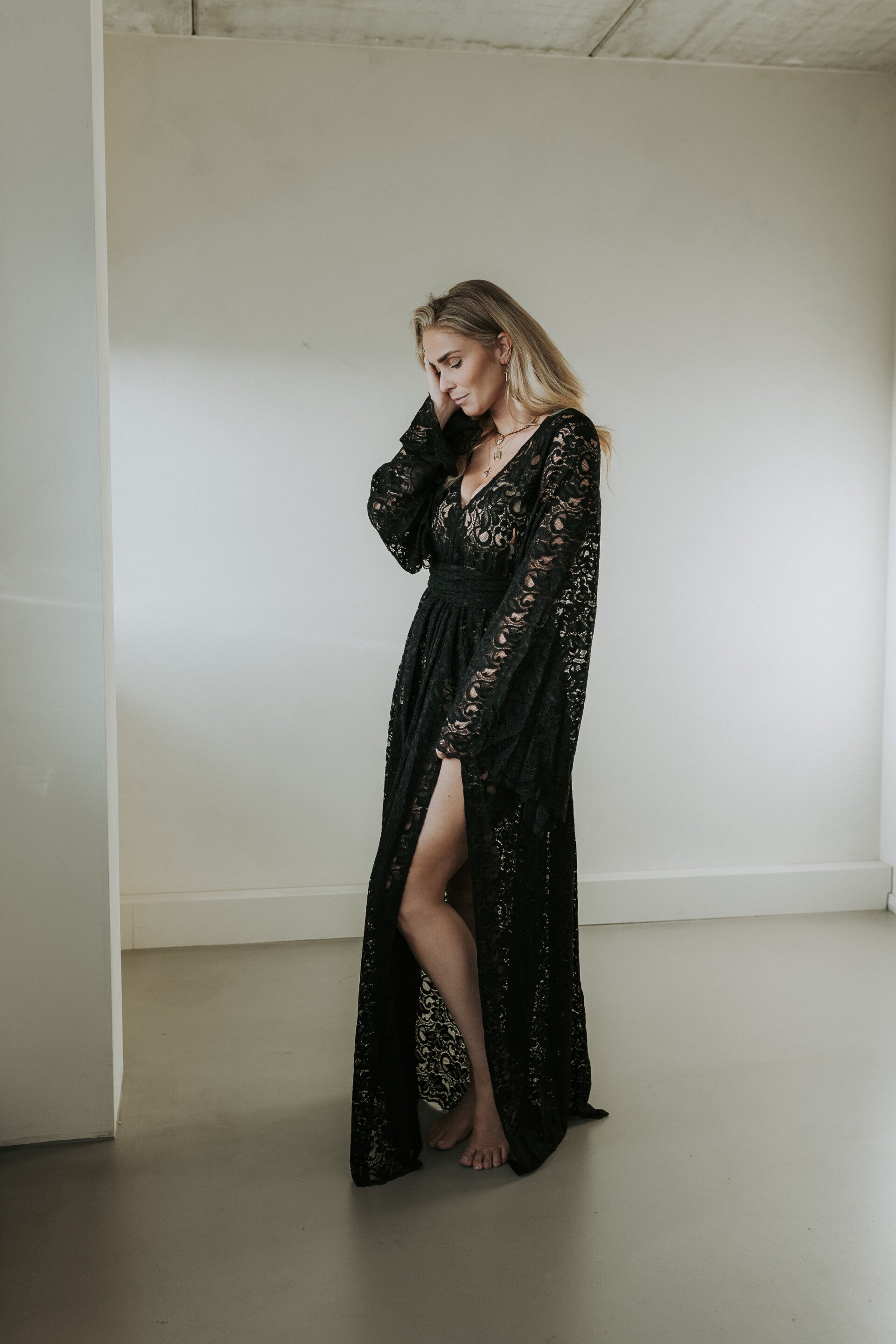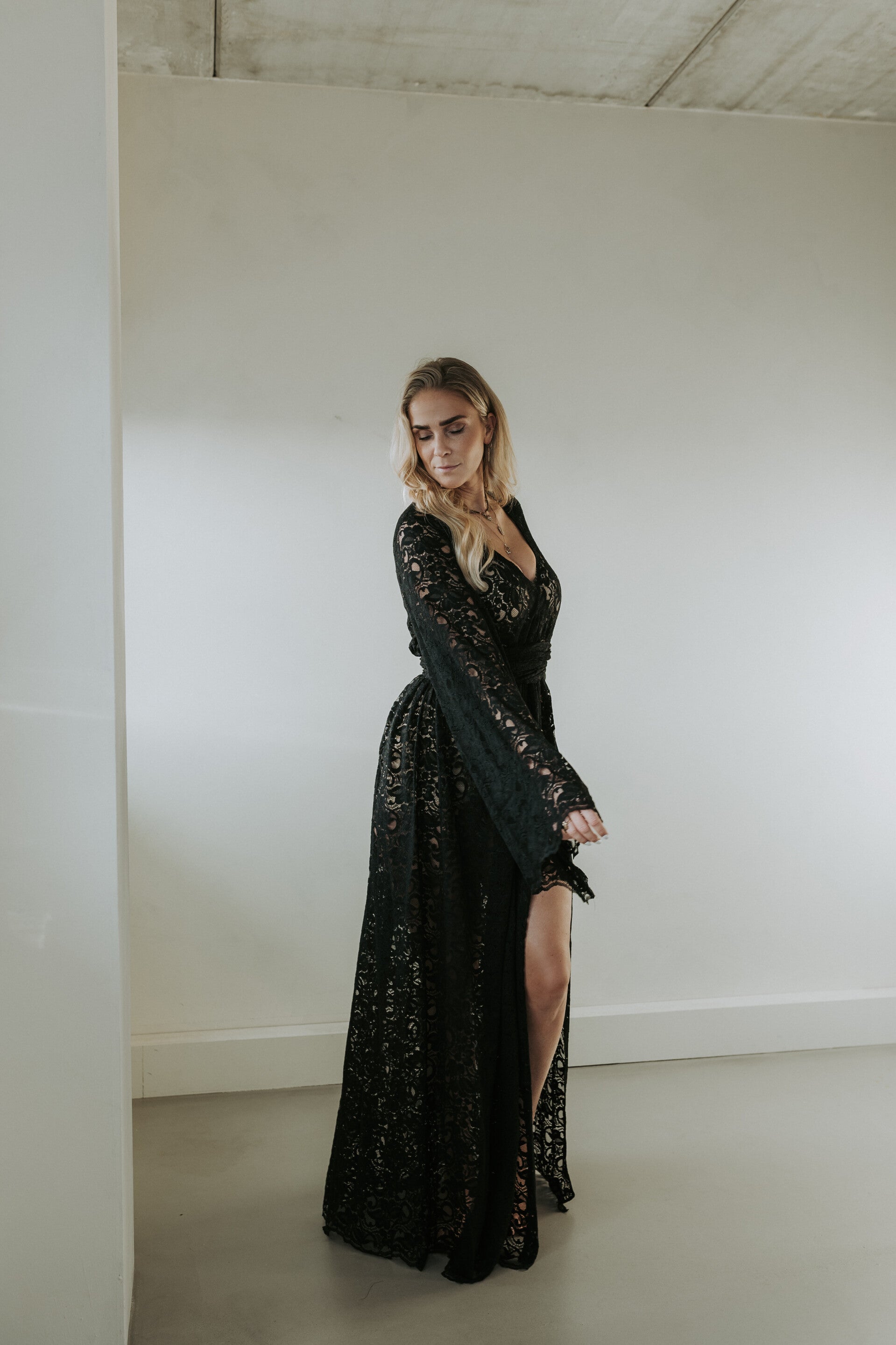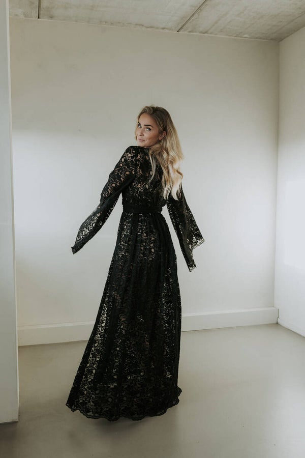 The pirate flare dress is made in black lace, viscose fabric and can be made by size from a size 34 until 42, you can add your own measurements in the notes while ordering your dream dress, add your waist, hips, bust and total length from neckline until the length you prefer.