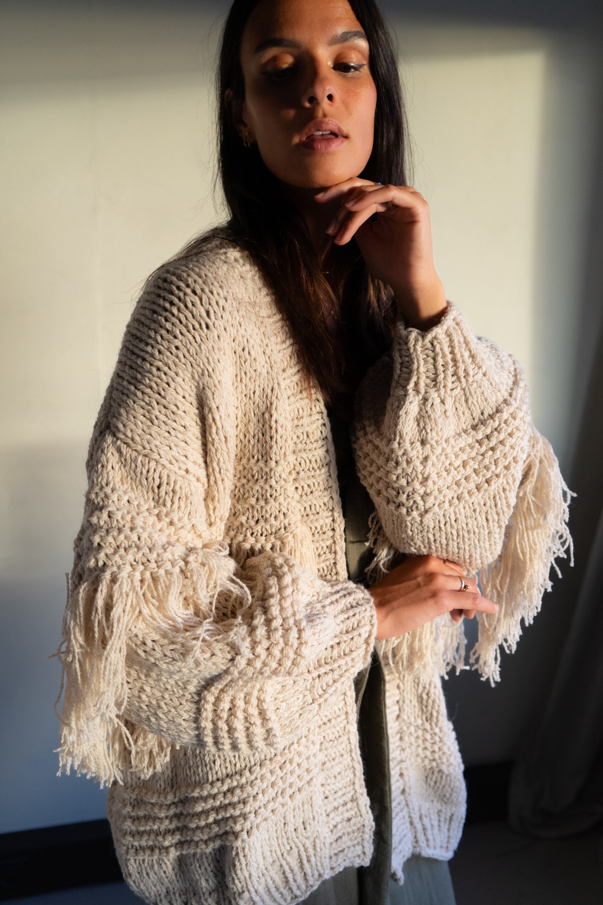 The handknitted fringe cardigan is made by a local knitter artist, out of 50% wool, 25% alpaca and 25% viscose, all natural materials and very soft in wearing the garment to the skin.
