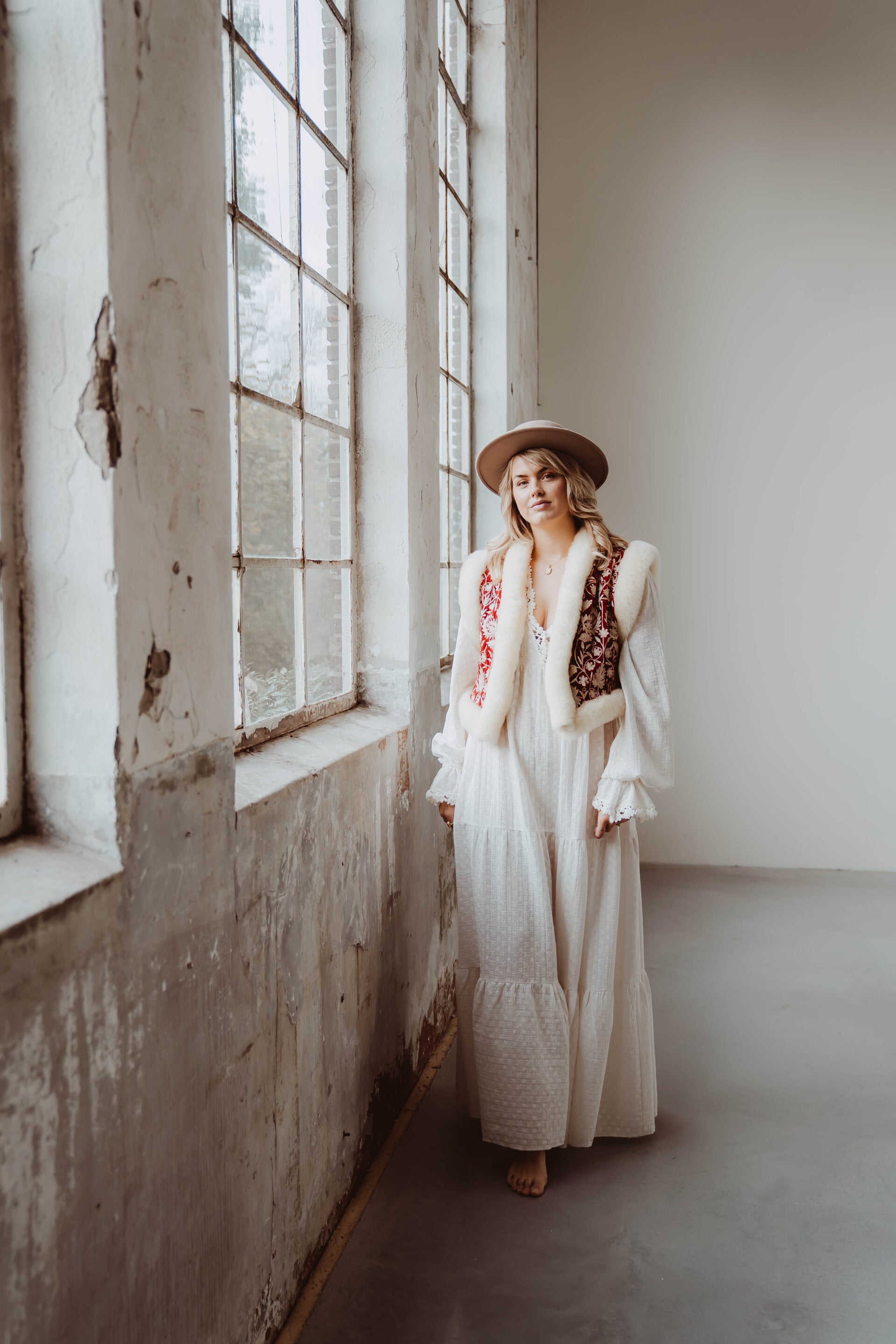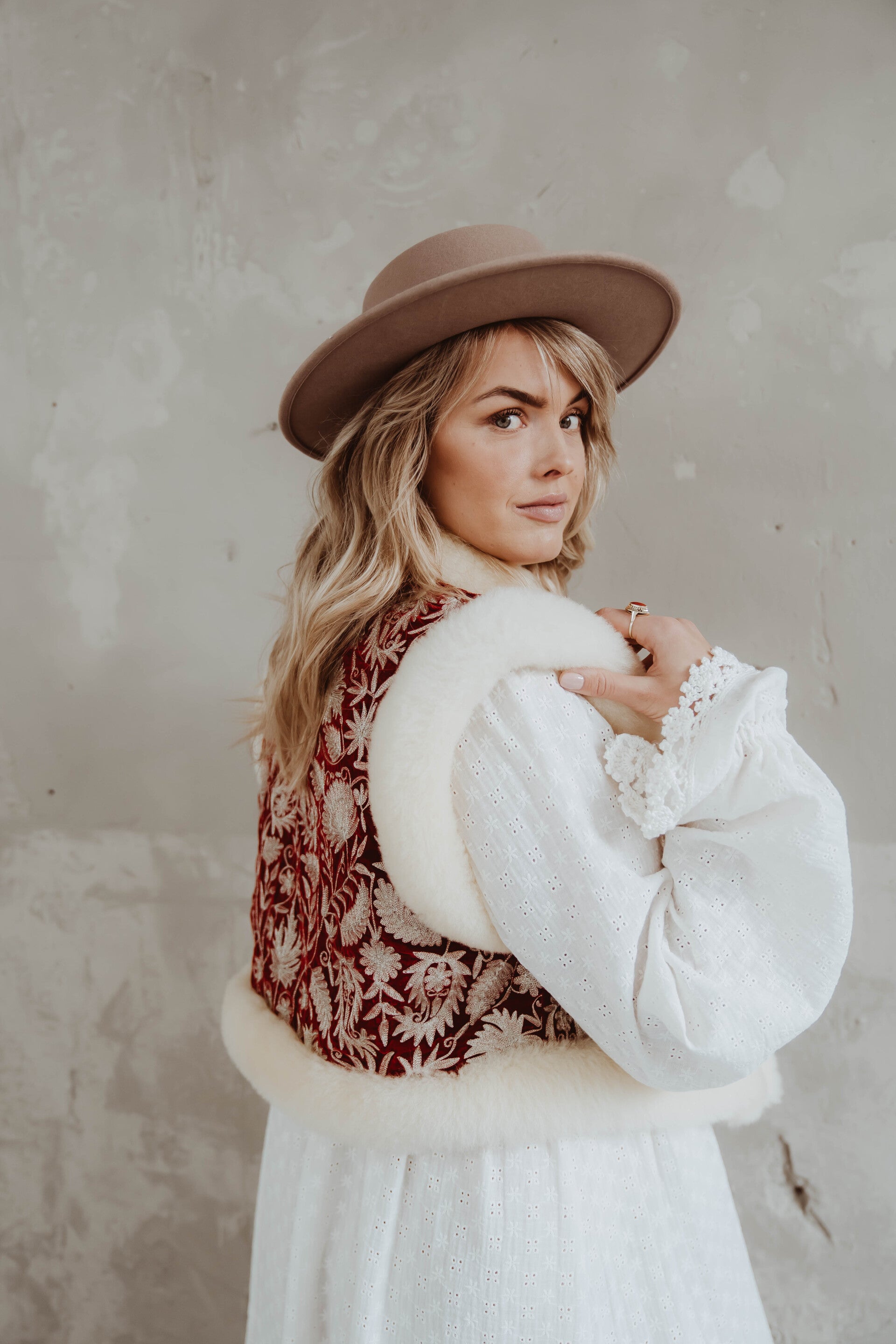 The sheepskin waistcoat is made of the most beautiful hand embroided velvet, with an undiyed sheepskin and linen lining. The size of the waistcoat is a one size fits from a size 34 untill a size 44.