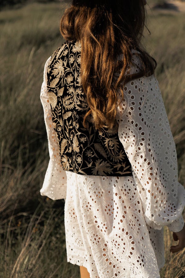 Made out of the most beautiful black velvet, with golden embroided flowers and linen lining. The Waistcoat is made in a one size fits from a size 34 untill a size 42.