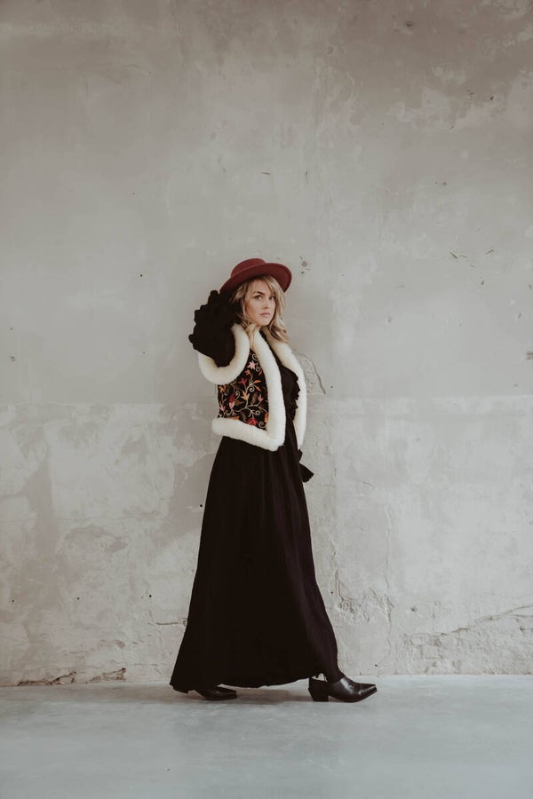 The sheepskin waistcoat is made of the most beautiful hand embroided velvet, with an undiyed sheepskin and linen lining. The size of the waistcoat is a one size fits from a size 34 untill a size 44.