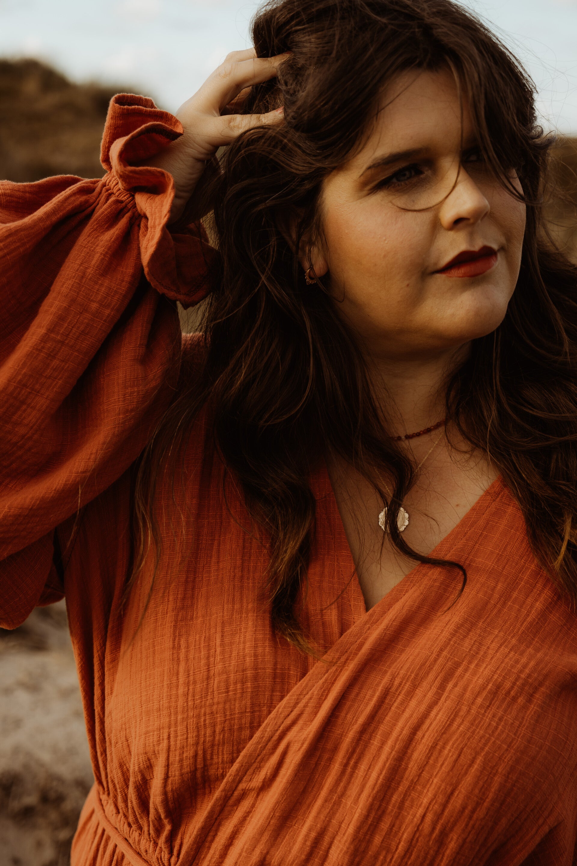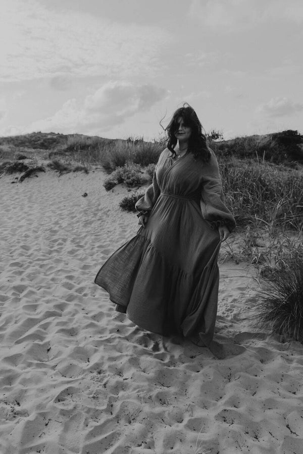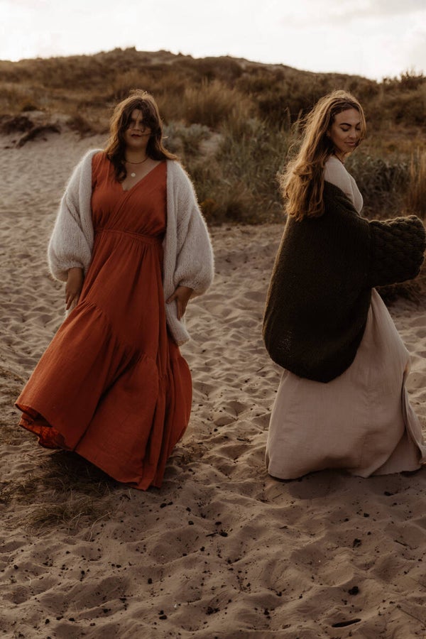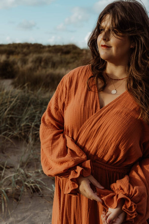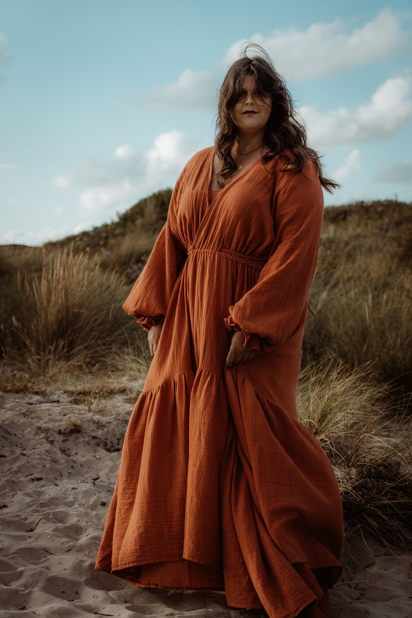 The emily gown in terra is a free sized dress and can be worn from a size 34 until 48 you can add your own length measurements in the notes while ordering your dream dress, for total length from neckline until the length you prefer.