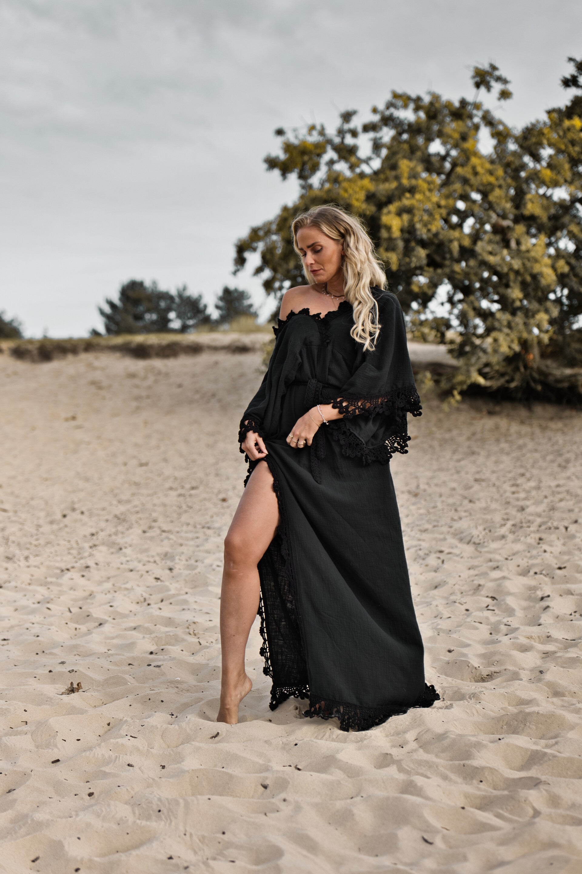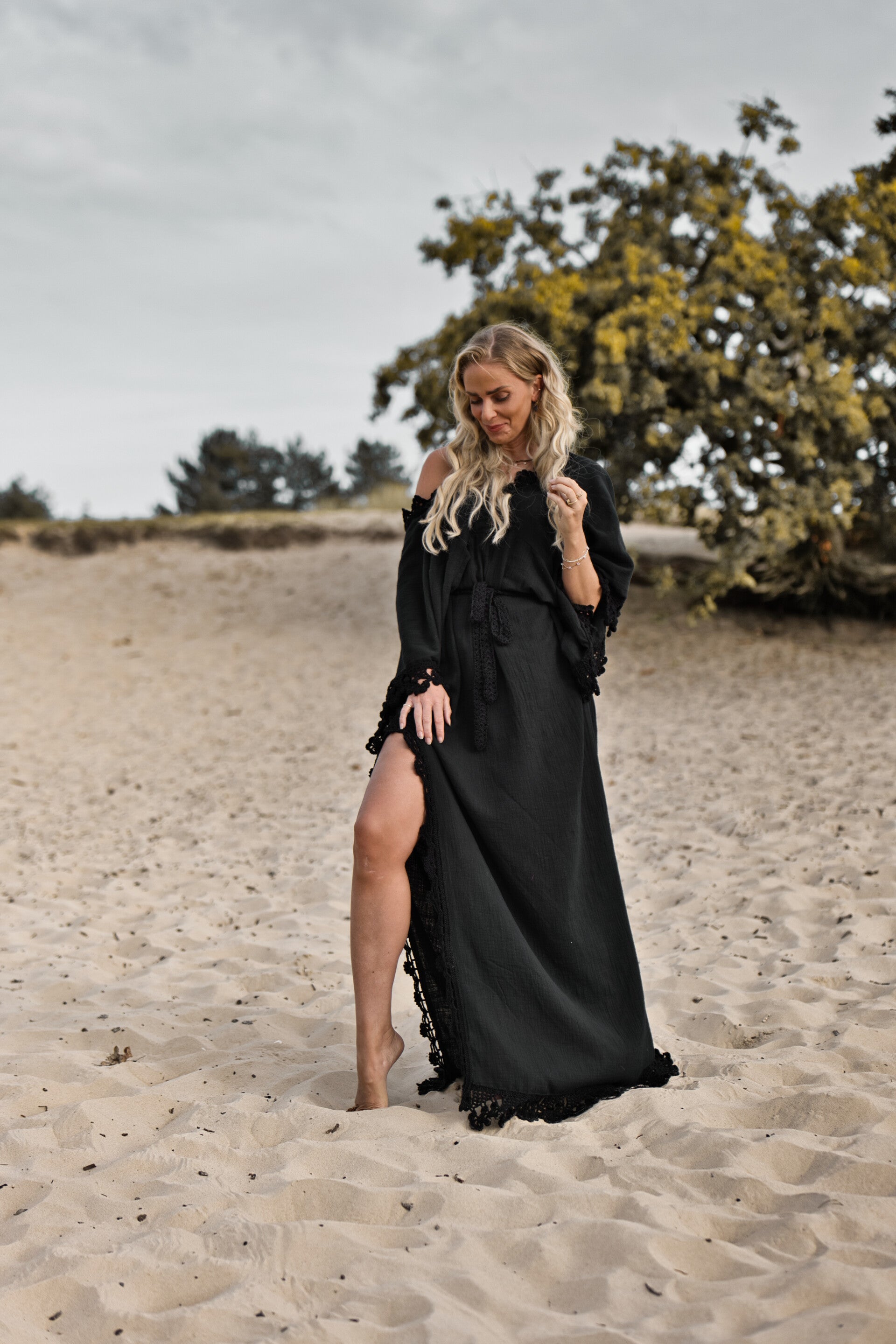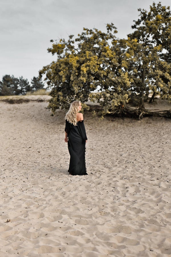 The butterfly dress in black with handknitted crochet details is a free dress that can be worn from a size 34 until 44 you can add your own length measurements in the notes while ordering your dream dress, for total length from neckline until the length you prefer.