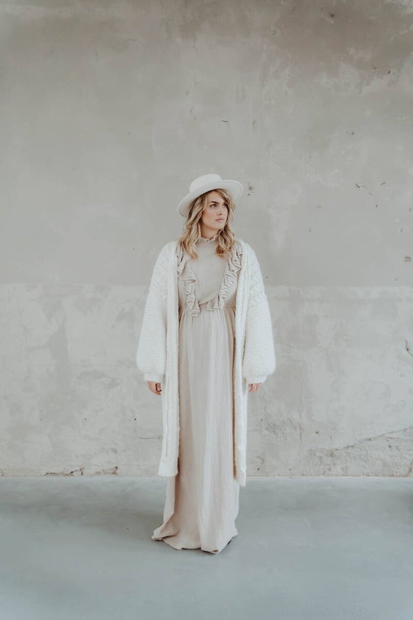 The yasmin dress in beige can be made by size from a size 34 until 42, you can add your own measurements in the notes while ordering your dream dress, add your waist, hips, bust and total length from neckline until the length you prefer.