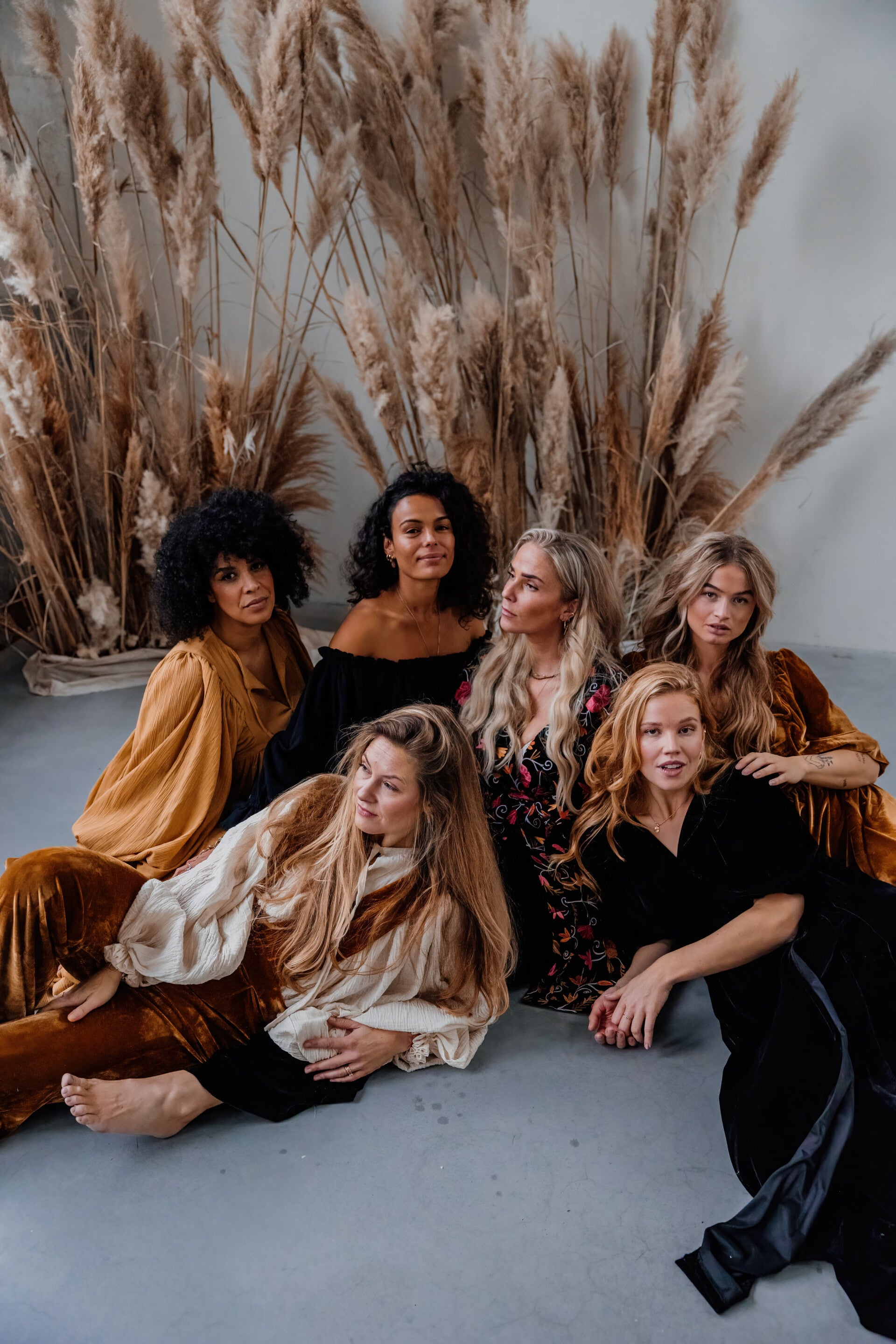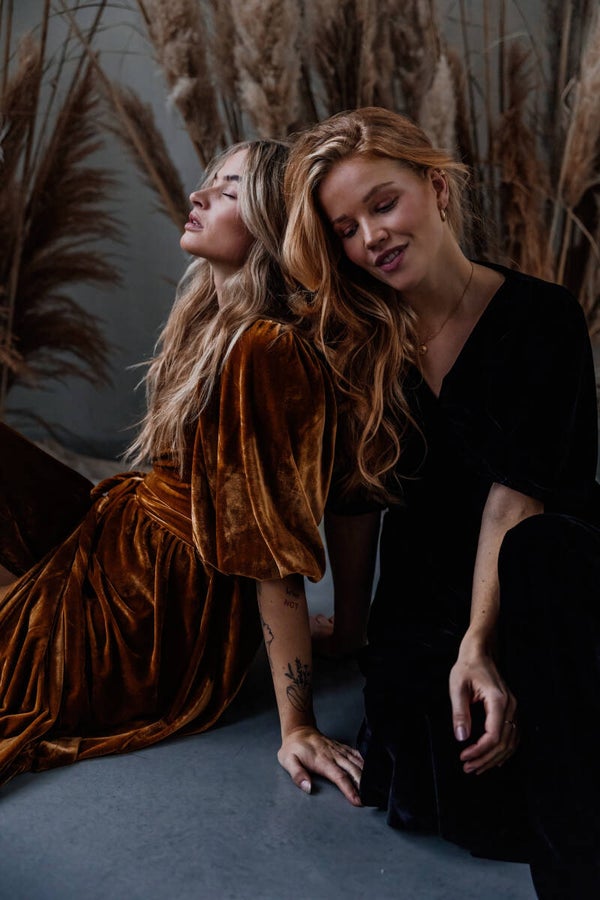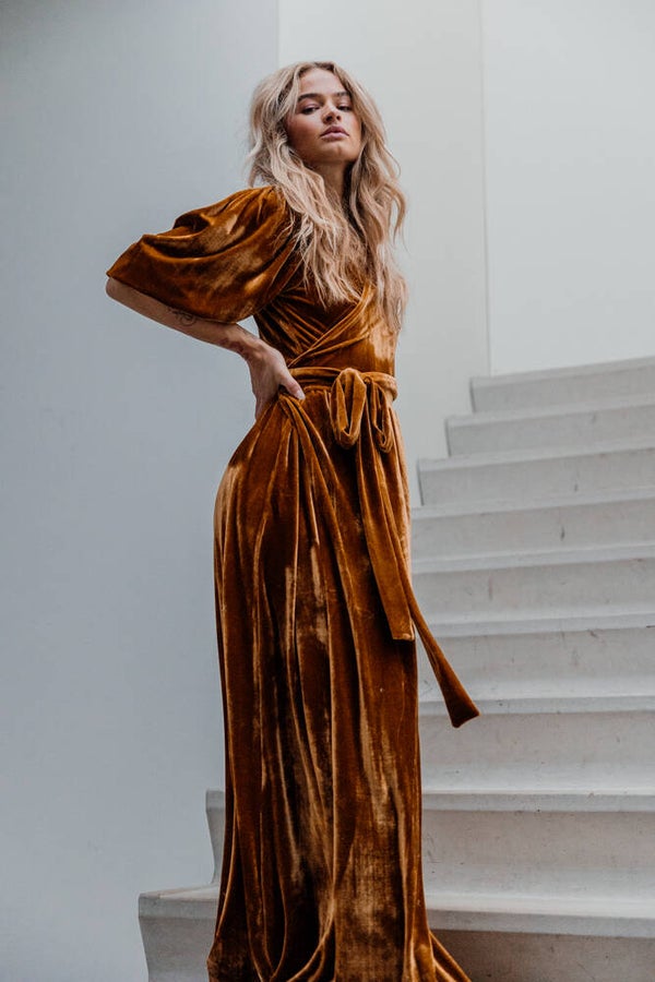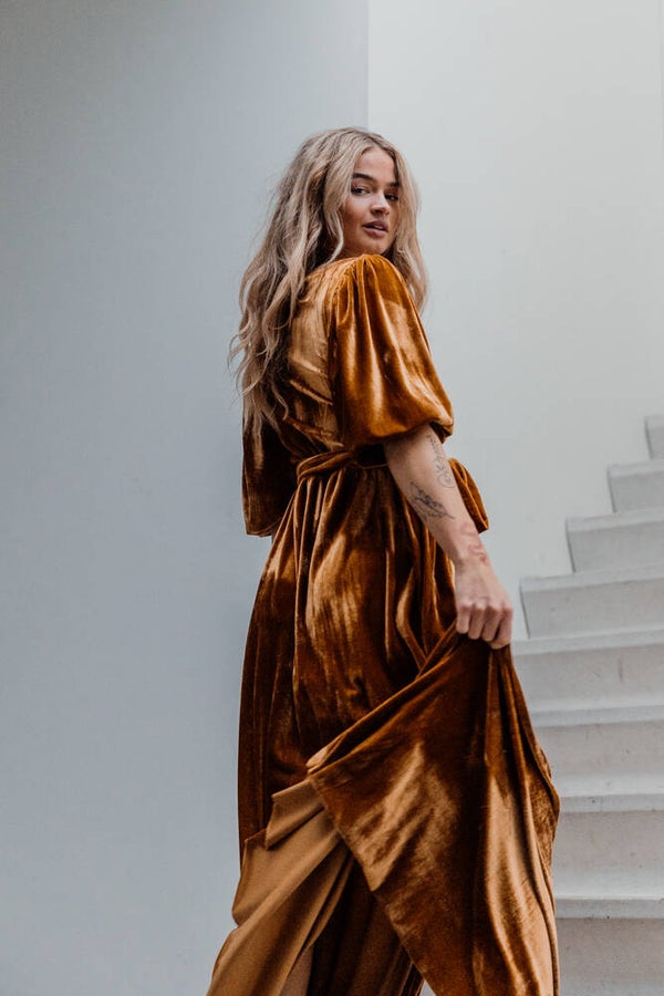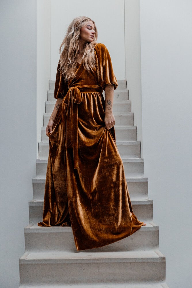 The yasmin dress in a stretchy golden velvet garment, available to wear from a size 34 until a size 42, you can leave the measurements tou prefer for the length of the skirt in the comments while placing your order.